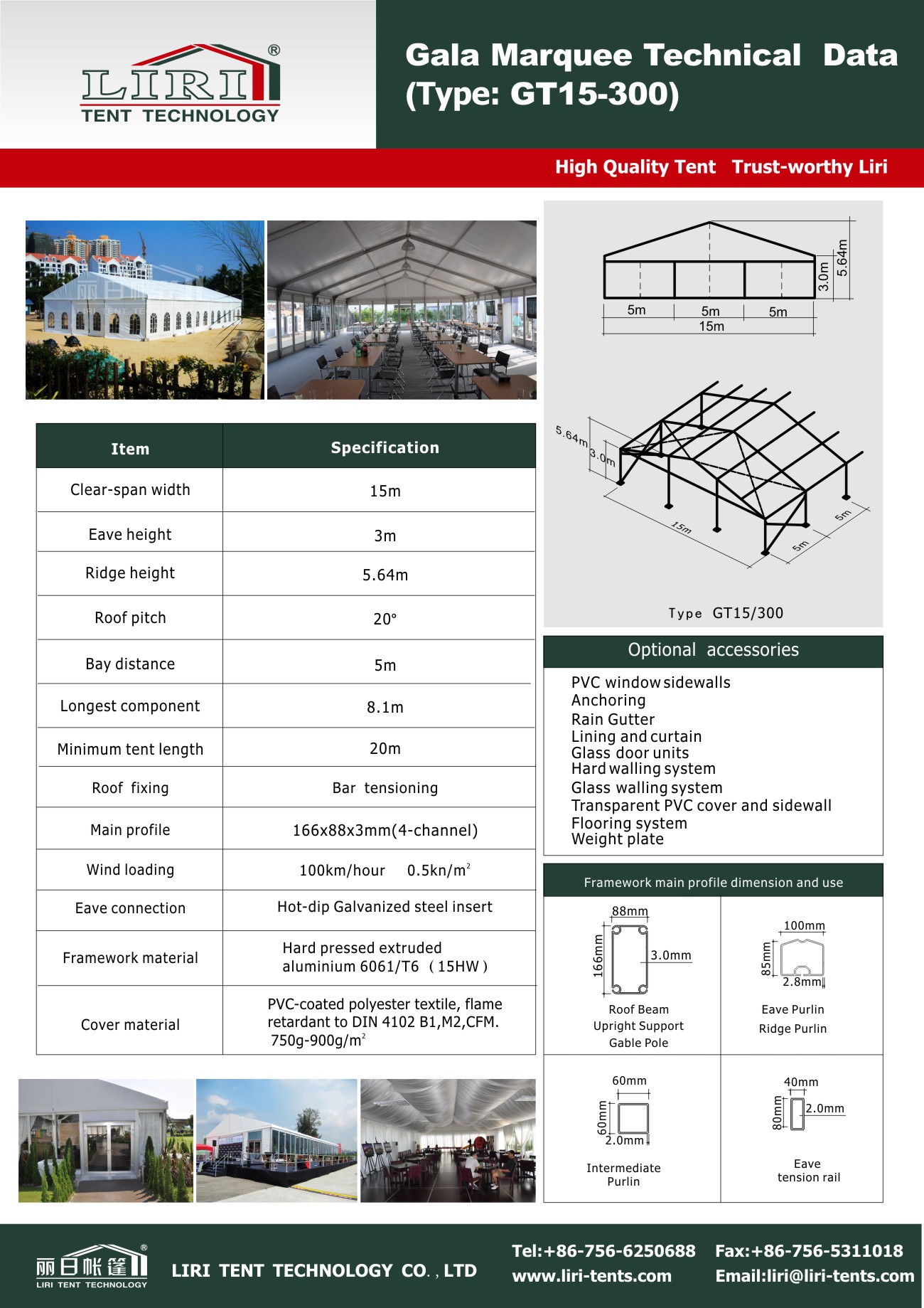 The picture below is a 15m width wedding tent with glass walls system all around for 300 people capacity wedding party. The length is not limited, it can be increased or decreased by 5m bay.